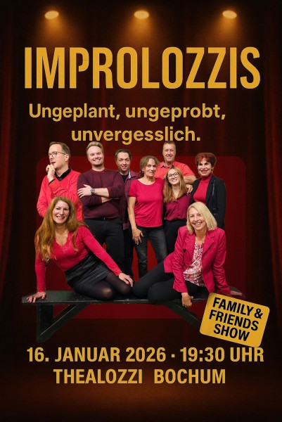 Die Improgruppe „Improlozzis“, entstanden aus dem Kurs von Andre Dinter, lädt "Family & Friends" zu ihrem allerersten Auftritt ein! Unter dem Motto „Ungeplant, ungeprobt – unvergesslich!“ erwartet das Publikum ein Abend voller spontaner Ideen, überraschender Wendungen und jeder Menge Humor.