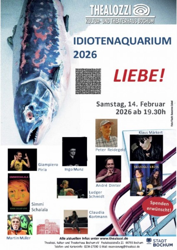 Im alljährliche Idiotenaquarium schauen die Künstler:innen rund um das Thealozzi dieses Jahr passend zum Valentinstag auf das Thema „Liebe“. Alle Künstler:innen werden sich an dem geplanten Samstag im ganzen Thealozzi verteilt - ähnlich einer lebendigen Ausstellung - mit diesem Thema beschäftigen - im Format des "Idiotenaquariums", das einst von der verstorbenen Schauspielerin und Regisseurin Gudrun Gerlach ins Leben gerufen wurde und dem wir inzwischen alljährlich die Ehre erweisen.